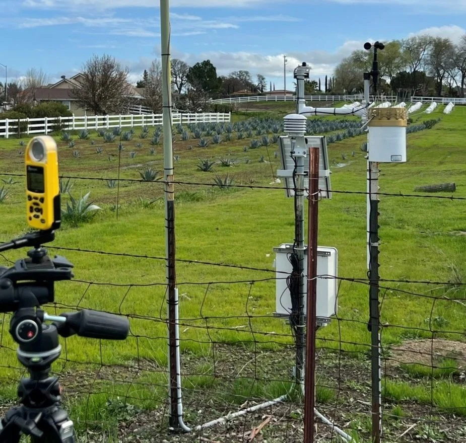 A picture of my portable weather station (yellow) working next to a professional one in Paso Robles wine country. This is a part of an exploration to apply IoT ideas to practice, in this case its uses in viticulture. This specific experiment is part of an effort to assess the feasibility of conducting informal spot checks of micro-climate variations.